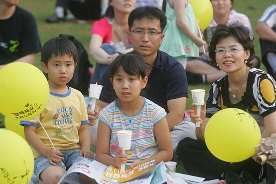 촛불문화제에 처음으로 참여했다는 백성심(37)씨는 7살, 5살 난 아이들과 남편 등 온 가족이 함께 광장으로 나왔다. 백 씨는 "한번쯤은 이 아이들에게 이런 모습을 보여주고 싶었다"며 "우리는 안 먹으면 되지만 어린 아이들은 급식이나 햄버거 등 너무 노출돼 있어 걱정"이라고 말했다.