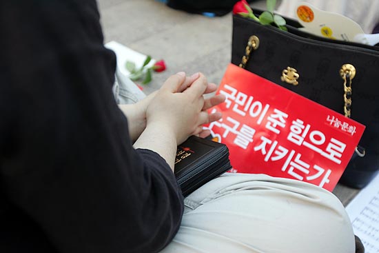 두손모아 '쇠고기 재협상'을 위해 기원하는 스님.[사진-통일뉴스 조성봉 기자]