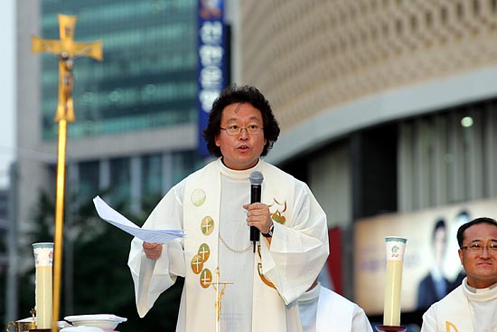 6월 30일 천주교 정의구현사제단이 첫 시국미사를 봉헌함으로써 종교계의 동참이 줄을 이어 정부의 '촛불끄기' 시도는 무력화됐다. 사진은 1일 '시국미사'에 참여한 천주교 정의구현사제단의 모습.[사진-통일뉴스 조성봉 기자]