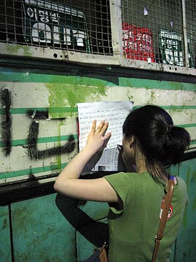400여명의 부상자가 발생했던 지난 주말, 경찰버스 밑에서 날아온 쇠뭉치에 발목을 다친 서송이(26) 씨가 정성스레 적은 편지를 종이비행기로 접어 경찰버스 위로 날려 보냈듯.