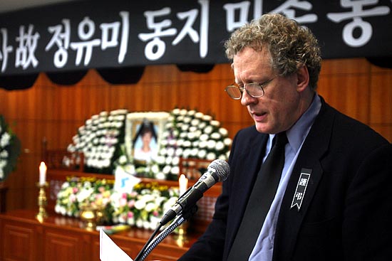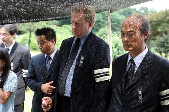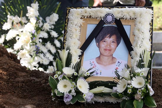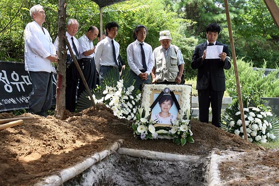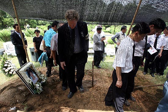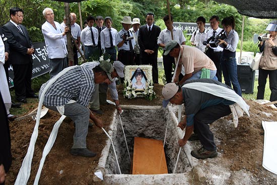 7개의 나무횡대가 관 위에 얹어졌고 첫 삽에 뜨인 흙이 '후드득' 관 위로 떨어졌다. 고인의 남편 쟈니 씨는 정기열 목사와 유족의 손을 양 손에 꼭 쥐고 이 장면을 바라봤고, 유족들은 얼굴을 돌리며 눈물을 훔쳤다. 유족들은 담담한 표정으로 고인을 떠나보내는 슬픔을 이겨내려는 모습들을 보여 지켜보는 이들로 하여금 안타까움을 자아냈다.