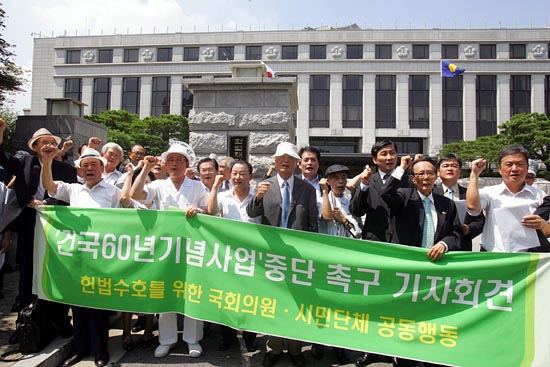 평화통일시민연대, 대한민국임시정부기념사업회 등 56개 단체들은 소속 회원 30여명이 참가한 가운데 7일 오전11시, 서울 종로구 가회로 헌법재판소 정문 앞에서 기자회견을 연 뒤, 헌법재판소에 '건국60주년 기념사업'에 대한 헌법소원을 제기하고 위헌 여부 결정이 내려질 때까지 정지해달라는 내용의 가처분 신청서를 함께 제출했다.