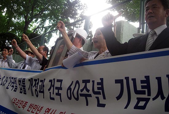 이들은 박흥식 한단연 공동대표가 낭독한 성명문을 통해 △건국60주년 기념사업 및 기념사업회 즉각 해산 △'8.15 건국절' 개정 위한 법률 조작 즉각 중단 △8.15 건국경축행사 폐기를 요구했다.