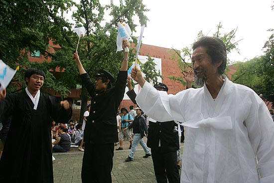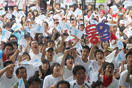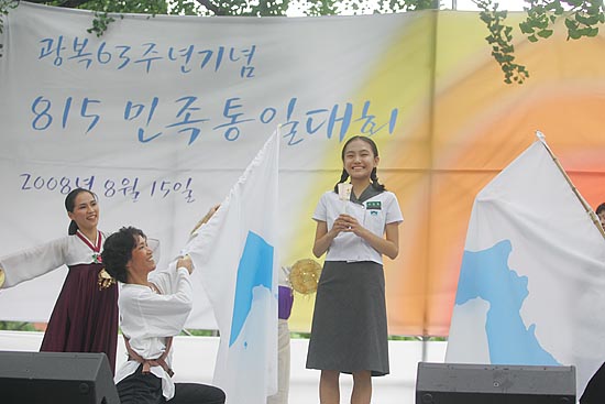15일 오후 4시, '광복 63주년 8.15민족통일대회'가 열린 서울 대학로 마로니에 공원은 전국에서 몰려온 시민.학생.노동자.시민사회단체 회원이 흔드는 단일기로 가득 찼다.