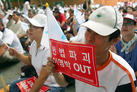 강기갑 민주노동당 대표도 무대에 올라 이날 오전 이명박 정부의 '건국 60주년' 행사를 규탄했다. 강 대표는 "이명박 정부의 탄압은 전방위적이다. 촛불도 진보연대도, 국민도, 방송도 탄압하더니 이제 상상을 초월하면서 국경일인 광복절도 왜곡시키고 있다"고 비난했다.