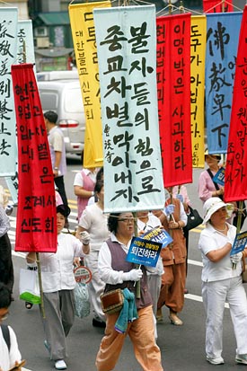이명박 정부의 '종교차별'에 반발해 온 불교계가 27일 오후 서울시청 앞에서 10만여 불자가 참여한 역대 불교행사 사상 가장 큰 규모의 '범불교도대회'를 열었다.[사진-통일뉴스 조성봉 기자]
