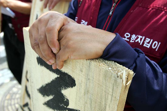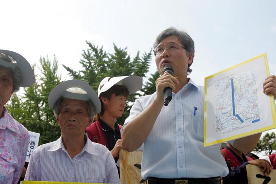 더운 날씨에도 불구하고 묘비를 들고 자리를 지킨 주민들.[사진-통일뉴스 조성봉 기자]