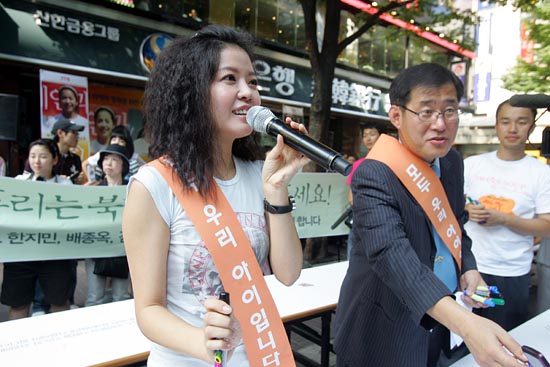 18일 오후 2시 서울 명동 인근에서 탤런트 한지민, 김여진, 노희경 작가(왼쪽부터) 등이 참여한 가운데 ‘한반도 화해와 평화를 위한 종교인 모임’ 주최로 한반도 화해와 평화를 위한 100만인 서명운동 거리 캠페인이 열렸다. [사진-통일뉴스 조성봉 기자]