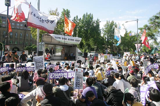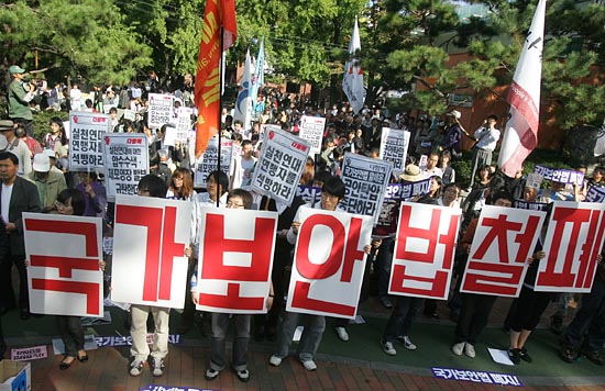 아울러 "이미 집권 6개월만에 국가보안법으로 28명이나 기소했으며, 국정원, 기무사, 보안수사대를 대대적으로 강화하고 검찰청 공안 3과를 부활기키고 있다"며 "촛불정국 이후 이명박 정권의 공안탑압이 본격화되고 있다"고 비난했다.