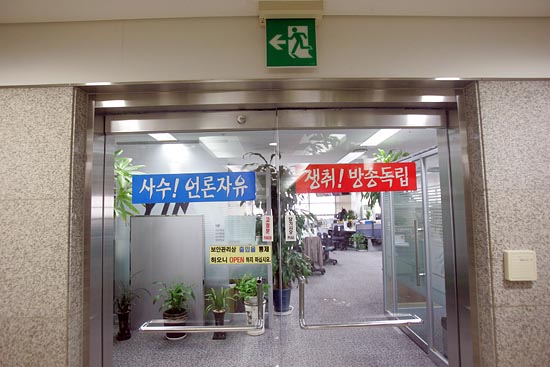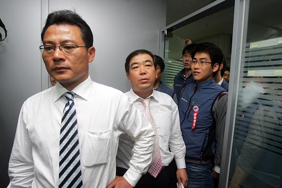 9일 오후 국회 문화관광위원회 생중계를 하지 않기로 결정한 데 대해, 노조원들이 항의하러 보도국에 들어서자 간부들이 황급히 빠져나가고 있다.[사진-통일뉴스 조성봉 기자]