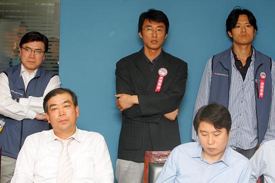 망연자실한 표정으로 서 있는 YTN노조원들.[사진-통일뉴스 조성봉 기자]