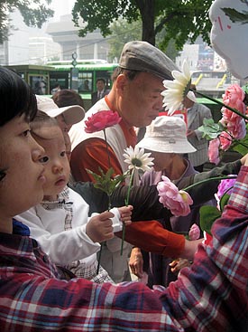40여 명의 참가자들은 한반도 평화체제의 조속한 구축을 촉구하며 '한반도 지도' 모형에 준비해 온 꽃과 '평화(PEACE)'라고 쓰인 작은 팻말을 차례대로 꽂는 상징의식을 펼치기도 했다.