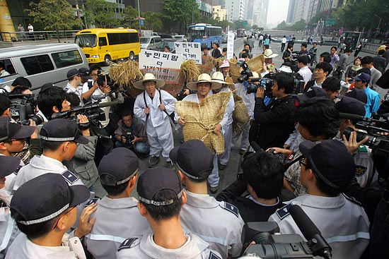 하지만 행진을 시작하자마자 경찰은 100여명 전의경을 투입해 농민들의 행진을 막아나섰고, 청계광장 밖으로 나가려 했던 농민들은 울부짖으며 ‘쌀직불금 부정수령 명단 즉각 공개하라', ' ‘농민 피 땀 다 가져 가라’고 항의했다.