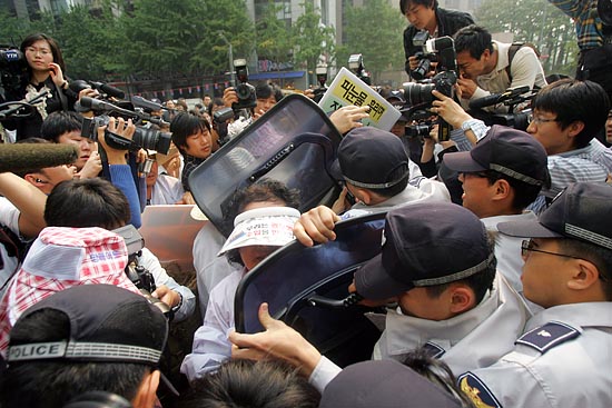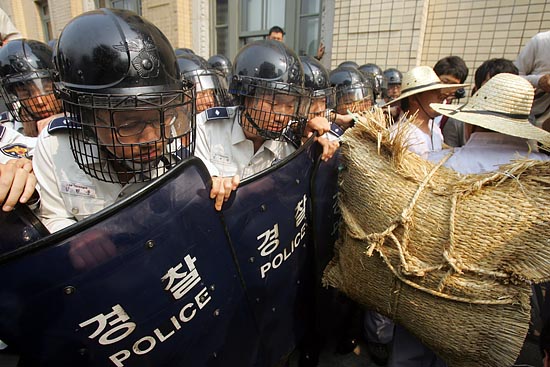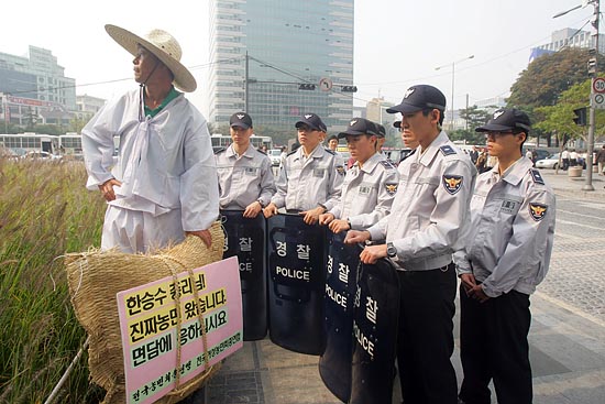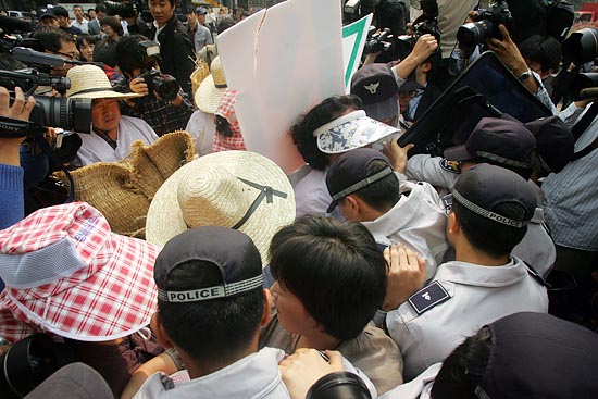 행진이 막힌 농민들은 “ 평화적으로 인도로 걸어가겠다는데 왜 농민들을 막아나서냐. 한승수 국무총리를 만나지 못하면 절대로 집에 돌아가지 않겠다”며 연좌시위에 돌입했다. 이에 경찰은 조금씩 길을 열었지만 30여미터도 못가서 또다시 행진을 차단했다.
