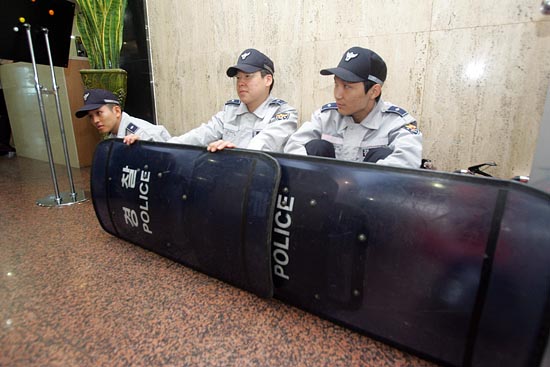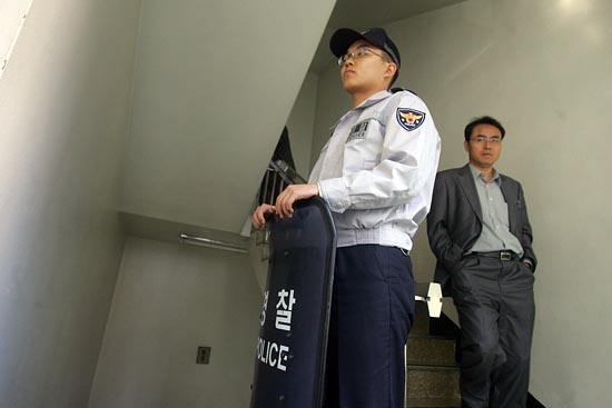 국가인권위원회(인권위, 위원장 안경환)가 27일 전원위원회 개최에 앞서, 인권단체들의 점거농성을 막기 위해 경찰측에 요청해 국가인권위원회 건물 1층과 6층 비상계단 등 내부에 수십 명의 경찰병력이 배치됐다. 경찰병력이 국가인권위 건물 1층 이외의 내부에 배치된 것은 이례적이다.