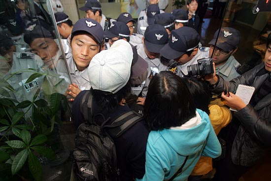 오후 1시 45분경, 인권단체연석회의 활동가 10여 명은 건물 내부의 양측 비상계단을 통해 전원위가 열리는 13층에 도착, 인권위원들의 전원위 회의장 진입을 저지했다. 그러나 20여 분 뒤, 인권위원들은 20여 명의 경찰병력을 앞세워 활동가들의 저지를 뚫고 회의장으로 들어갔다.