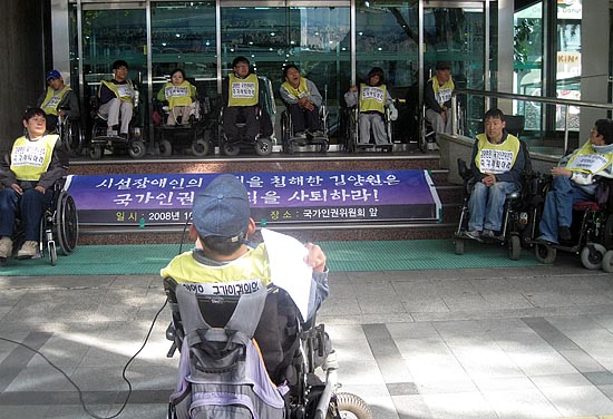 또 그는 "이명박 정부는 인권위원회를 국가기관으로 존속시키기 위한 것이 무산되자 인권위원을 자기 사람으로 만들기 위해 낙하산 인사를 감행했다"며 "대통령이, 한나라당이 추천했기 때문에 그 사람을 묵묵히 인권위원으로 받아들이는 다른 위원들은 양심의 손을 얹고 생각해봐야 한다"며 "국가인권위원회는 장애인의 목소리를 잘 듣고 자기 정체성을 찾아야 될 것"이라고 주장했다.