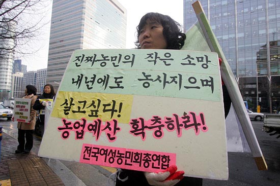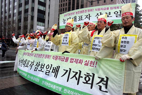 전국농민회총연맹, 전국여성농민회총연합 소속 농민대표자들은 20일 오후 2시, 서울 청계광장에서 정부종합청사까지 '한미FTA반대!농민생존권쟁취!식량자급률법제화실현'을 요구하며 삼보일배를 진행했다. [사진-통일뉴스 조성봉 기자]