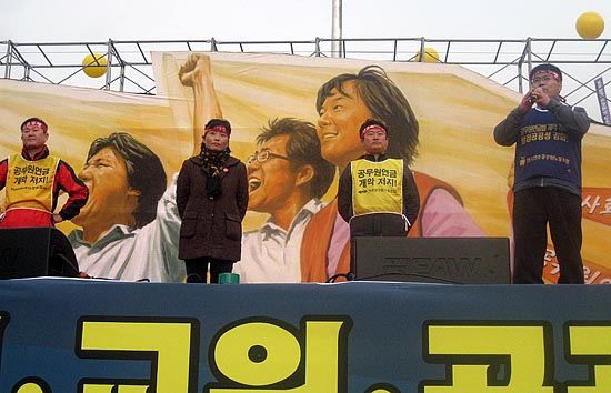김찬균 공무원노동조합총연맹 위원장도 "이명박 정부는 출범하면서 가장 먼저 낮은 자세로 섬김의 봉사를 다하겠다고 했지만 지금 섬기고 있나"며 "군림하고 억압하고 있다. 먹통하고 있다. 합법적인 공무원 단체들과도 대화를 않고 있다"고 질타했다.