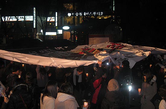 오후 5시가 넘고 날이 금세 어두워지자 대회장에서는 촛불이 피어났다. 촛불을 나눠 든 400여 명의 참가자들은 '국가보안법 폐지', '양심수 석방'이라는 손피켓을 번갈아 들면서 "국가보안법 폐지"와 "공안탄압 저지"구호를 힘차게 외쳤다. 특히 참가자들은 국보법을 상징하는 대형 현수막을 무대에서 이어받아 동시에 찢는 상징의식을 펼치며 국보법 폐지를 촉구했다.