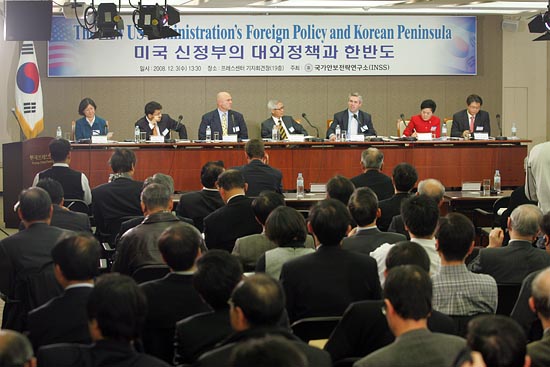서재진 원장이 이끄는 통일연구원이 2일 국내인사 위주로 '미국 신정부 출범과 대북.통일정책 추진방향'이라는 주제로 토론회를 열었고, 3일 역시 '보수'인사로 꼽히는 남성욱 교수가 소장으로 있는 국가안보전략연구소는 미국측 전문가를 불러 '미국 신정부의 대외정책과 한반도' 토론회를 진행했다.