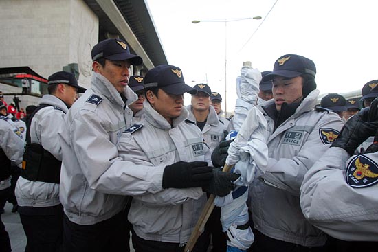 경찰이 플랜카드를 빼앗으려 잡아당기고 있다.[사진-통일뉴스 조성봉 기자]