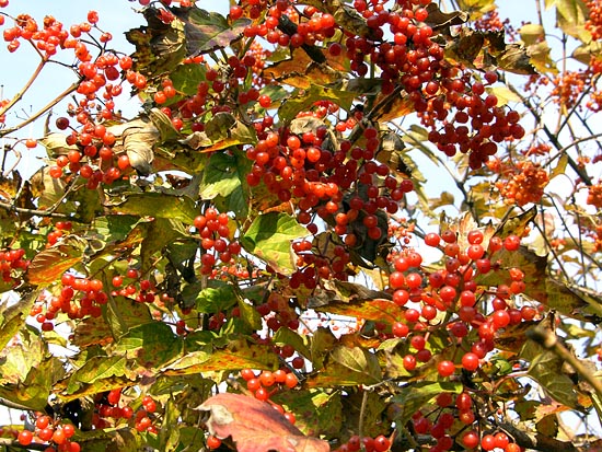 때마침 징검다리 철이라서 덤불로 하얗게 핀 꽃은 주목을 받고 가루받이가 이루어진 다음에는 빨간 열매들이 흐드러지게 익을 차례다