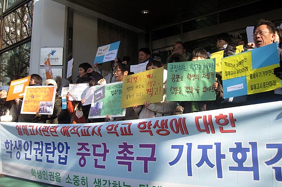 청소년인권활동가네트워크 등 16개 인권.청소년단체들은 22일 오후 1시, 서울 중구 국가인권위에서 진정서 제출에 앞서 기자회견을 열어 이같이 폭로하고 "학생들의 표현의 자유와 집회의 자유, 신체의 자유와 이동의 자유 등의 인권을 침해하고 있다"고 주장했다.
