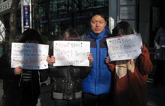 파면 징계를 받은 정상용 구산초등학교 교사를 응원하기 위해 자리를 함께 한 3명의 제자들은 "선생님을 도우려고 왔어요", "너무 억울해서요", "선생님은 피해자예요" 라며 '선생님'을 '변호'했다.