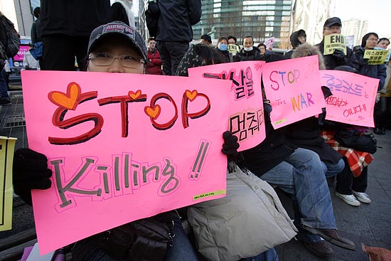 시민들이 희생된 팔레스타인인들을 추모하며 헌화하고 있다. 곽정숙 민주노동당 의원(왼쪽에서 세 번째)도 참가했다.[사진-통일뉴스 조성봉 기자]