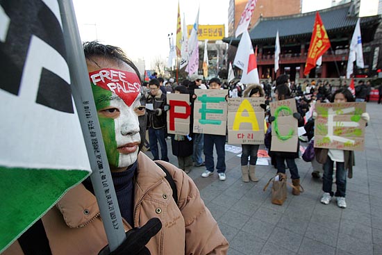 10일 오후, 서울 보신각 앞에서 75개 단체들은 이스라엘의 팔레스타인인 학살 중단 촉구 긴급행동'을 열었다. [사진-통일뉴스 조성봉 기자]