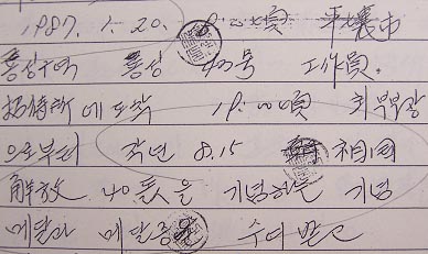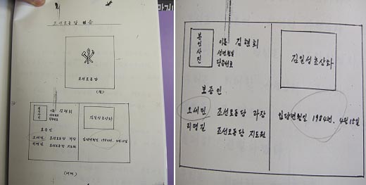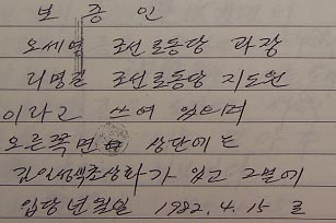 ▷ 그런데 김현희가 직접 그린 당증엔 입당일인 1982.4.15이 ‘1984.4.15’로, 또 입당보증인 오세영이 ‘오세민’으로 되어 있음. (수사기록1576쪽 첨부그림)