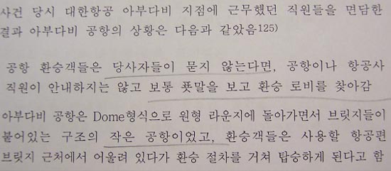 ▷ 국정원종합보고서는 당시 대한항공 아부다비 지점장 김태환 등 지점 직원 3인과 면담한 결과, “공항직원이 환승객의 여권이나 비행기표 제시를 요구하거나, 압류하는 경우는 없다”는 것을 확인함. (국정원종합보고서291~292쪽)