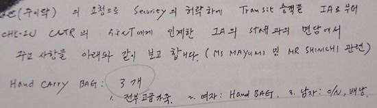 ▷ 실제 두 사람은 또 다른 짐이 있었음. 그것은 이라크 항공 측이 밝힌 ‘고급가죽가방 3개’에 의해 증명됨. 이는 항공기수화물로 탁송되었음을 의미함. (국정원종합보고서593쪽 첨부자료)