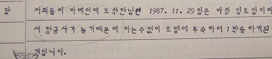 ▷ 바레인보고서엔 두 김이 리젠시-인터콘티넨탈 호텔 투숙 당시 12.2까지 예약했다고 되어 있음. 실제 바레인에서의 김현희와 김승일의 행동은 급박하게 도망갈 의지가 전혀 없었음.