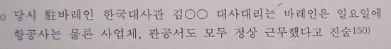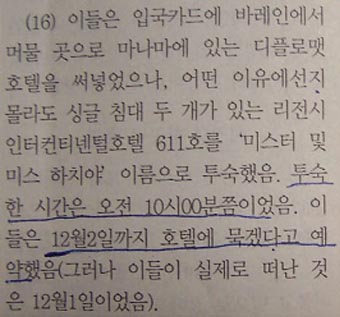 13-2. 바레인 입국신고서엔 투숙 예정지로 디플로매트 호텔이라 기재했으면서도 리젠시-인터콘티넨탈 호텔에 투숙한 데 대해 리젠시-인터콘티넨탈 호텔 투숙이 사전에 예정되어 있었던 게 아니냐는 의문이 제기됨.