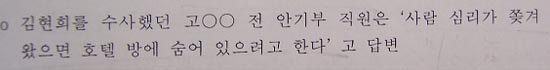 ▷ 어쨌든 두 김이 곧장 바레인을 떠나지 않은 데에 대해 김현희를 수사했던 안기부의 고○○는 국정원과거사위에 “사람 심리가 쫓겨 왔으면 호텔방에 숨어 있으려고 한다”라는 허황된 답변을 함. (국정원종합보고서300쪽)