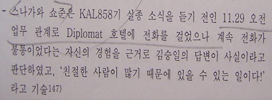 ▷ KAL858기 공작여정 이전에 해외실습여행을 수차례 가진 바 있는 정예공작원으로서의 김현희가 이러한 초보적인 문제도 인지하지 못하고 있었다는 점에 대해 도저히 납득할 수 없음.