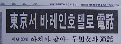 14-1. 두 김이 리젠시-인터콘티넨탈 호텔에 투숙한 직후인 11.29. 10:30~17:00경 도쿄로부터 한 여성이 미스터 하치야를 찾는 2통의 국제전화가 걸려와 객실로 통화가 연결됨. (바레인보고서18항, 조선일보1987.12.5자 11면, 한국일보1987.12.5자 1면 등)
