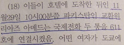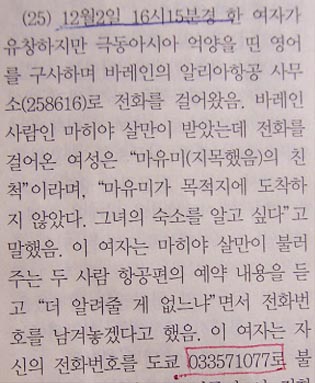 ▷ 그렇다면 시간적인 차이에도 불구하고 이 전화가 ‘마유미의 소재를 문의한’ 그 전화일 가능성을 배제할 수 없음. 이는 두 김이 다른 비행노선이 많음에도 불구하고, 굳이 ‘암만 경유, 로마행’을 고집한 사실에 의해서 뒷받침됨.