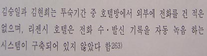 ▷ 국정원종합보고서는 “당시 리젠시-인터콘티넨탈 호텔엔 전화 수.발신 시스템이 구축되어 있지 않았다 함”이라며 당시 안기부 수사의 한계를 인정하는 듯한 인상을 주고 있지만, 김현희의 진술과 안기부 수사발표 어디에도 ‘2통의 전화’ 자체에 대해 언급조차 없음. 이는 당시 안기부가 고의적으로 은폐한 것이란 반증임.