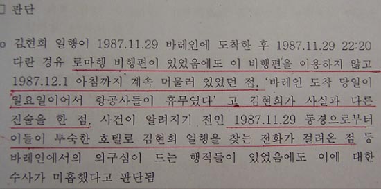 ▷ 이러한 사실로 볼 때 두 김은 김현희의 진술대로 바레인 공항에서 공항경찰의 도움에 의해 우연히 리젠시-인터콘티넨탈 호텔에 투숙한 게 아니라, 실상은 사전에 이미 리젠시-인터콘티넨탈 호텔 투숙이 예정되어 있었음을 알 수 있음.