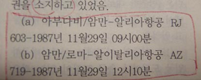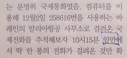 ▷ 바레인보고서는 이 전화가 분명히 국제전화였다고 전제하면서도, 당일 위 알리아 항공사 전화번호(258616)로 걸려온 국제전화는 오전 10:15 요르단 암만으로부터 걸려온 단 한통의 전화뿐이었다고 하여 시간적으로 차이를 보임.