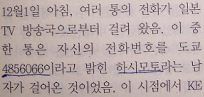 15-2. 이보다 하루 앞서 12.1 아침 두 김이 바레인 공항으로 향한 직후, 일본 TV방송으로부터 두 김을 찾는 여러 통의 전화가 걸려옴. 이 중의 한 통은 하시모토라는 남자로부터인데, 자신의 도쿄 전화번호(034856066)를 남김. (바레인보고서19항)