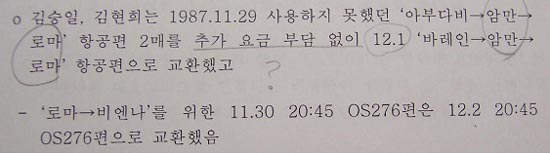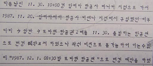 16-1. 김현희는 바레인 입국 다음날인 11.30, 마나마 시내관광과 쇼핑을 한 뒤, 알리야 항공 마나마 지점에 가서 전날 일정의 ‘아부다비→암만→로마행’ 항공권을 다음날인 12.1자 ‘바레인→암만→로마행’ 항공권으로 교환하고, 또 알리탈리아 항공 마나마 지점에서 ‘로마→비엔나행’ 항공권 날짜를 변경 예약했다고 진술함. (수사기록883쪽-4회자필진술서, 수사기록3035쪽-12회자필진술서, 수사기록3749쪽-1회검찰신문조서, 수사기록4013~4014쪽-4회검찰신문조서)