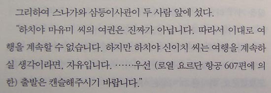 ▷ UAE 아부다비 주재 한국대사관의 류시야 참사관은 이에 대해, “UAE 주재 일본대사관 측이 본국정부로부터 ‘두 하치야의 여권 모두 무효’란 통보와 함께, 조사 지시 훈령을 받았다는 얘기를 들었다”고 진술하였으나, 바레인 현지의 김정기 한국대사관 서기관은 “일본대사관 측이 바레인 공항 당국에 ‘두 하치야 중 마유미의 여권이 가짜임’을 알리고 조사를 위해 출국정지를 요청했다”고 진술함. (수사기록372쪽-류시야 자필진술서, 수사기록392쪽-김정기 자필진술서)