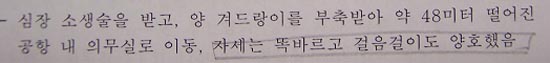 ▷ 당시 김현희의 출국을 저지했던 스나가와 쇼준은 “경비관이 여자의 양쪽 겨드랑이를 부축해서 공항 내 의무실까지 걸어가게 했다”라고 증언함. (KBS스페셜, 아사히TV, 스나가와 쇼준의 ‘긴급지령’)