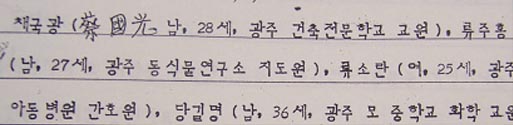 12-1. 김현희는 중국 광저우 체류 시 1년간 사귄 중국인 지인들의 이름 중에서 차국광(‘蔡國光’-28세 남자 미혼 광주동식물연구소 지도원)과 당결명(‘唐吉明’-36세 중년 여성)에 대해서 여러 차례 언급함. (수사기록794~795,799쪽-3회자필진술서)