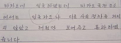 16-2. 김현희는 마카오 입국을 위한 중국 출국 시엔 직접 출국심사를 받지 않고 광저우 주재 박창해 지도원이 출국수속을 대행해 줬다고 진술함.