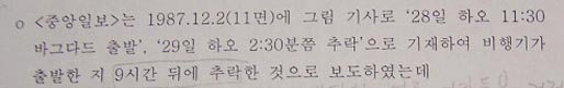 ▷ 또 이 시점에 전혀 알 수 없는, “(폭발물은) 9시간 이후 폭발되도록 조작”이란 보도가 등장함. (중앙일보1987.12.2자. 경향신문1987.12.2자)